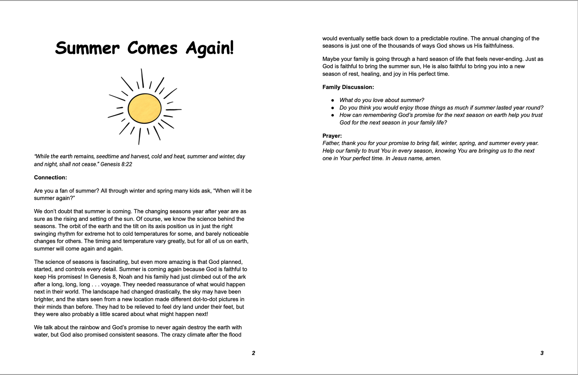 Going to the beach? Connect building a sandcastle to not being conformed to the world. Rained out? Talk about God’s showers of blessings! Enjoying a splash pad? Relate it to living water flowing in our hearts.